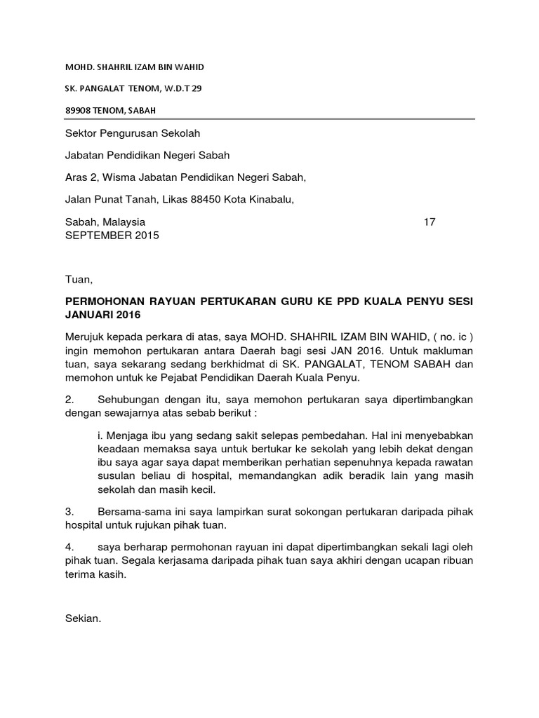 Contoh surat rayuan an pertukaran mengikut suami. Surat rasmi permohonan pertukaran jawatan kosong contoh surat rasmi. Cikgu Hailmi Sabtu November 01 2014.